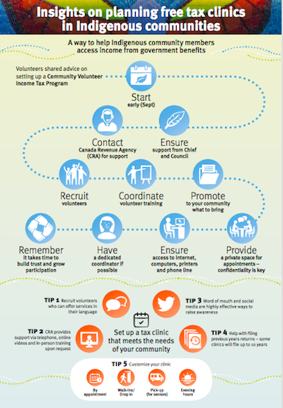 This infographic features advice to help Indigenous communities and organizations set up free income tax clinics. Advice was shared by clinic volunteers through a roundtable and interviews as part of the First Nations Financial Wellness project.
